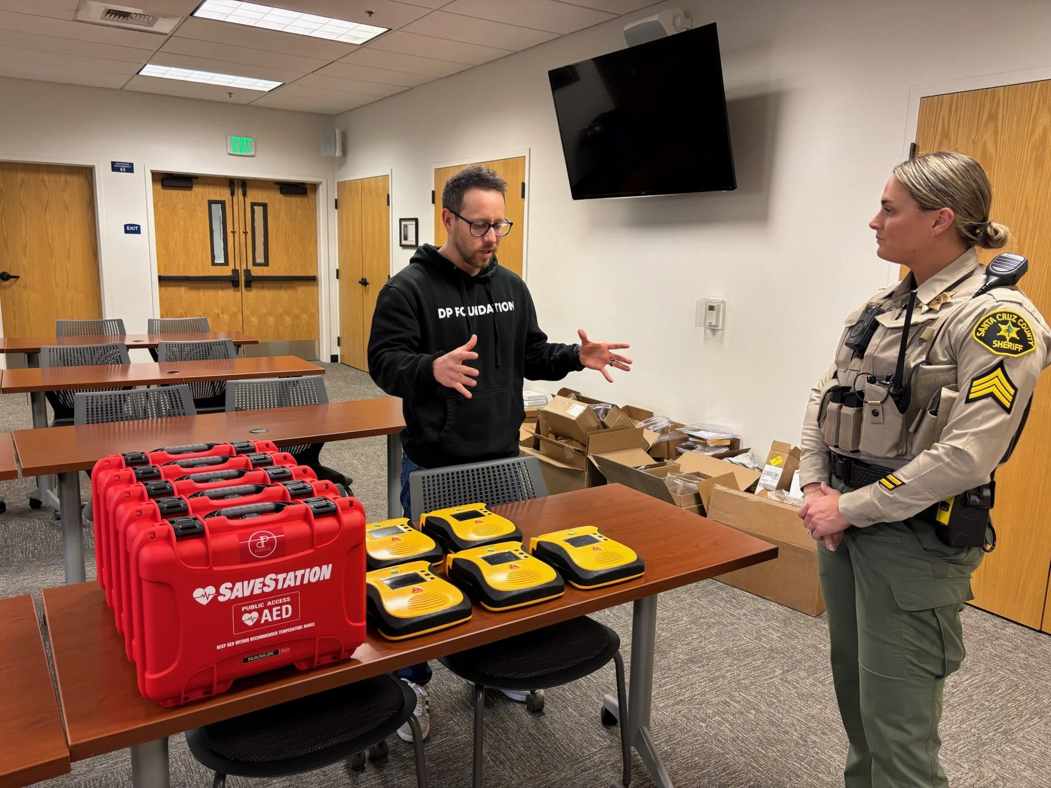 Adam Lang, Founder and President of the DP Foundation, and Hilary Gates, founder of Six Minutes to Live, joined the Santa Cruz Police Department and Santa Cruz County Sheriff’s Office to celebrate the donation of 10 AEDs